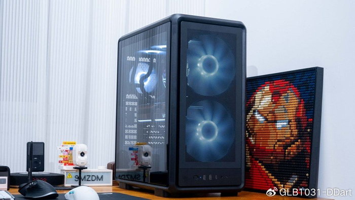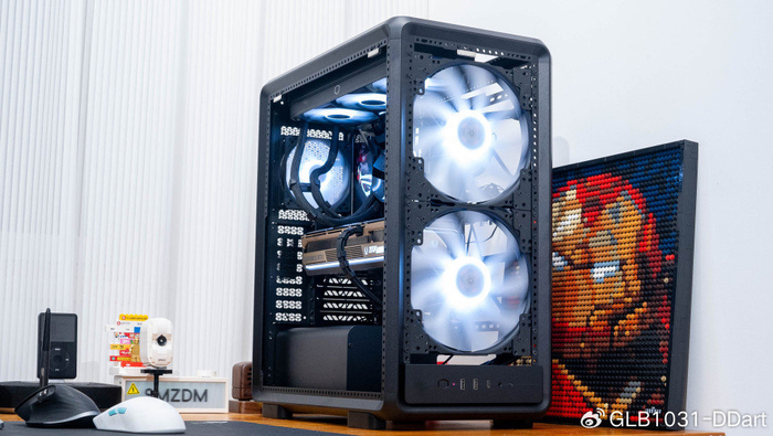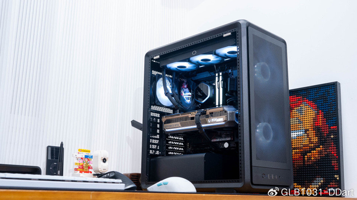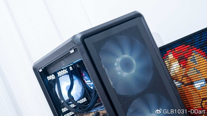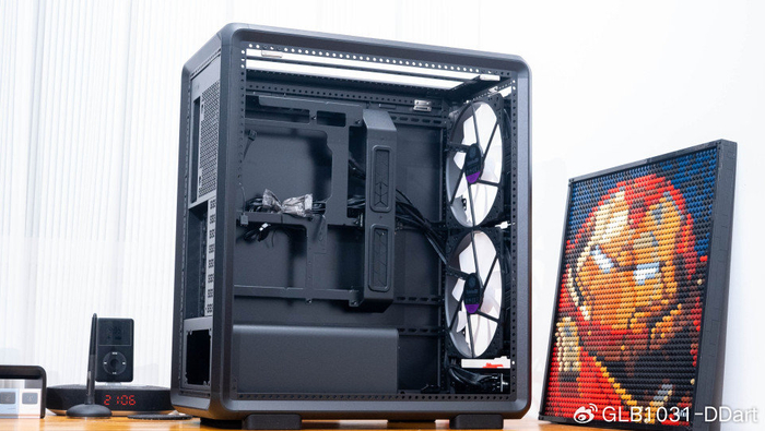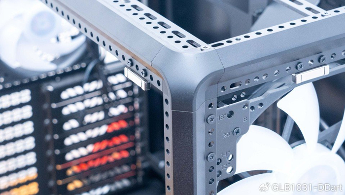 机箱正面预装的两把20cm直接的ARGB风扇确实壮观,铝制框架结构细节也可以通过附件内支架替换安装360mm冷排。
