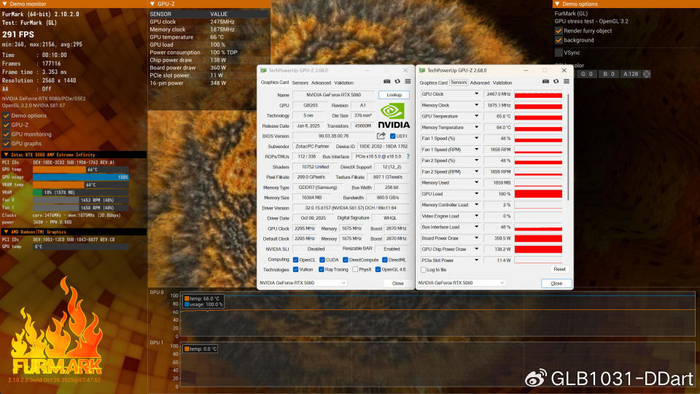 索泰 RTX 5080 AMP EXTREME INFINITY 显卡的Geeks3D FurMark 显卡单烤测试,GPU频率2467 MHz,显卡TDP 359.5 W,显卡核心温度 65.8 ℃。