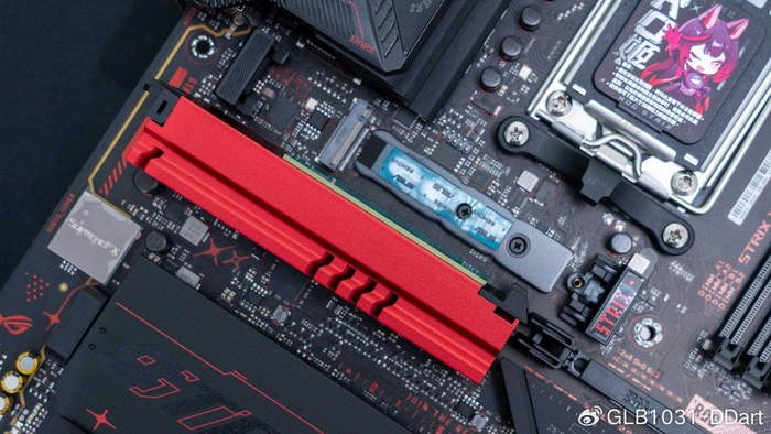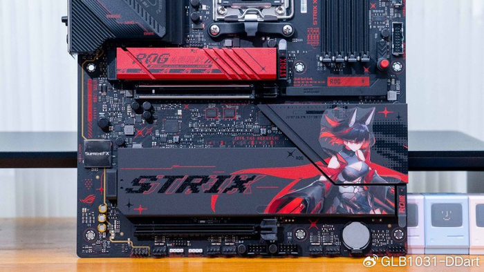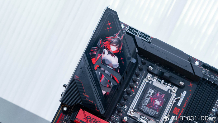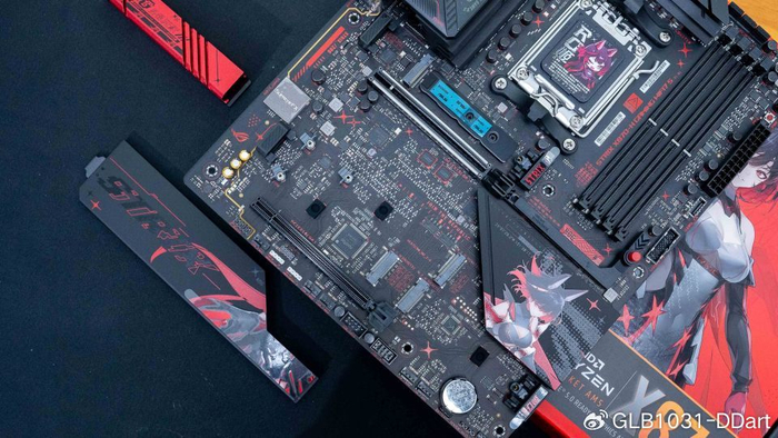 黑红配色的X870 RO姬主板整体采用黑红的配色设计,主板上的RO姬元素可谓无处不在。在主板的IO区域以及下半部的散热装甲上都设计了彩色涂装的RO姬形象,而且可以看到整体在EZ快拆设计上更进一步,所有的M.2 SSD都采用易拆卸设计,装机易用性上非常不错。