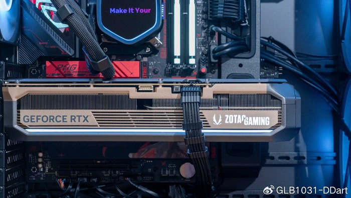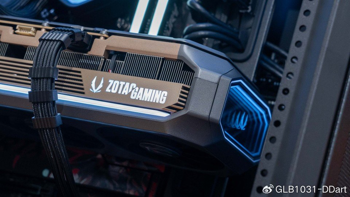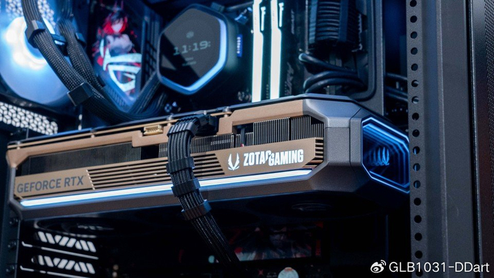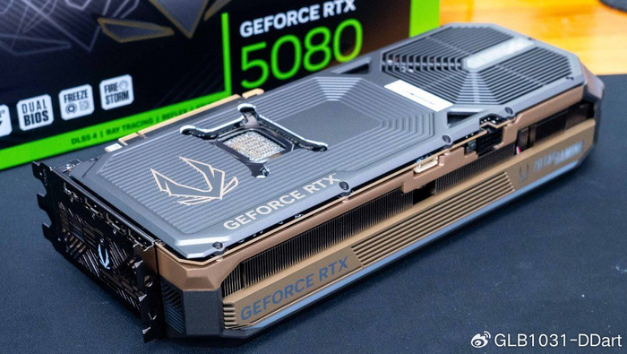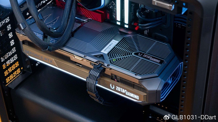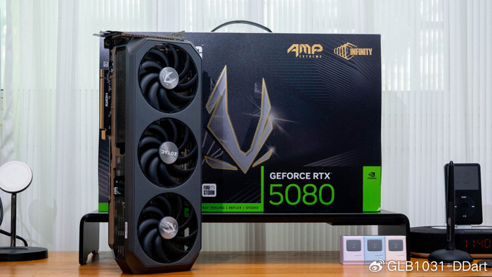 显卡选择的是索泰RTX 5080 AMP EXTREME INFINITY,AMP之前就定位于索泰的旗舰系列。在RTX 50系外观上相比前代40系可以说是颠覆的设计变化,一改之前的圆润设计,这次更方正了很多,在显卡尾部还加入了无限镜的灯光元素。