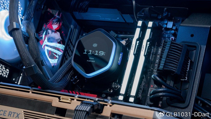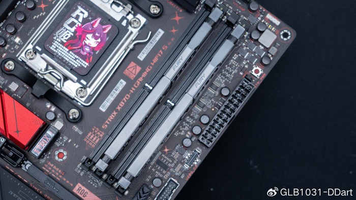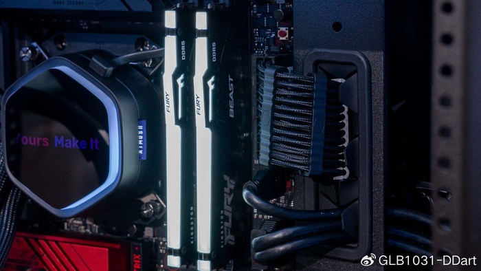 内存安装效果,内存顶部区域内嵌了12颗独立LED灯珠设计,支持18种预设灯光效果。日常可以与主流板厂实现一键灯光同步,也可以通过FURY CTRL软件进行灯光控制。