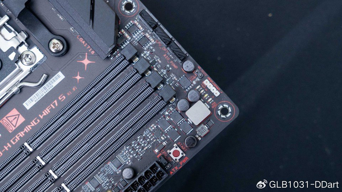 主板提供了多个风扇接口,风扇口采用了防尘塞处理,细节处理得非常不错,同时主板还支持AI智能散热2.0技术,能够让风扇在低温和静音之间找到最佳平衡点。内存插槽右下侧还配备了1个5V RGB接口。此外主板顶部还设计了一个红色的START 开机按键,方便裸机装机测试。