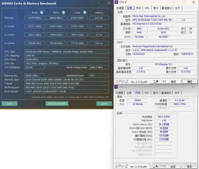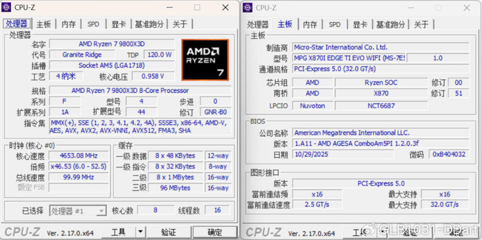 CPU-Z查看处理器以及微星 MPG X870i EDGE TI EVO WIFI主板信息,BIOS已经更新至最新版本。