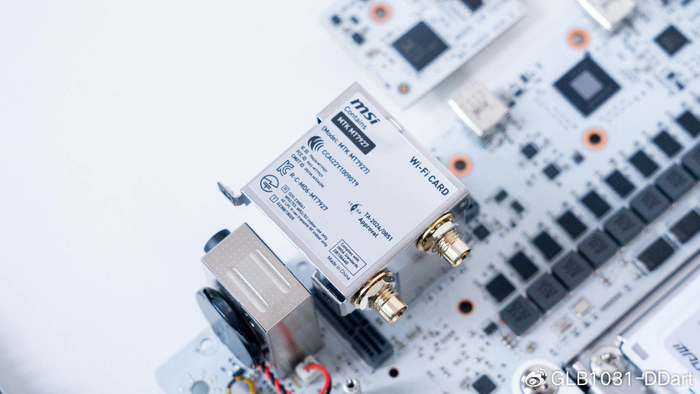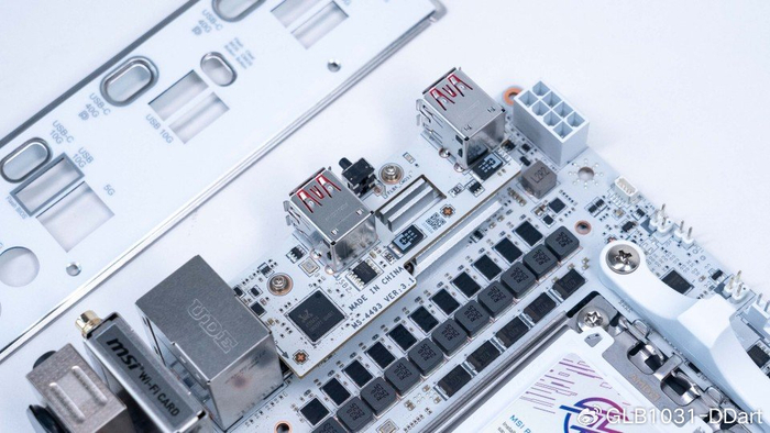 在ITX这样紧凑设计的主板中,如果你拆开微星 MPG X870i EDGE TI EVO WIFI主板的IO区域你会发现就连IO部分也做了多层的堆叠设计以实现更多的扩展接口。