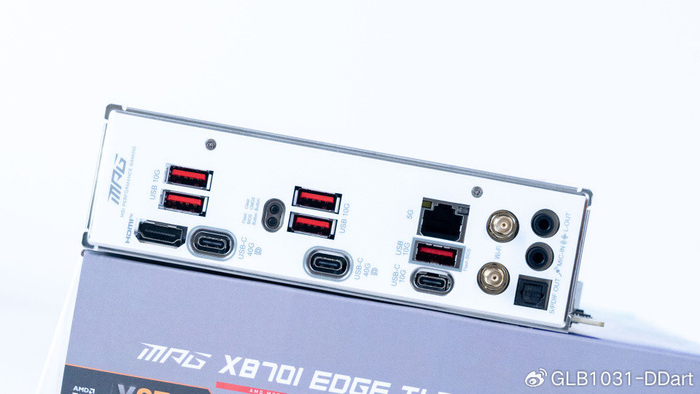 IO扩展方面提供了5A3C的组合,提供了5个10Gbps的红色USB-A接口以及三个Tyep-C接口,其中两个Type-C接口还是支持DP 1.4视频输出的40Gbps高速接口。另外还提供了一个HDMI 2.1接口。5G有线LAN、Wi-Fi 7天线接口及带S/PDIF输出的音频接口。整体接口配置还是非常丰富的,日常扩展应该足够了。