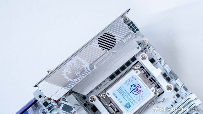 主板供电区域的银白色的散热装甲上采用了不同的细节处理方式,内部还内置了一个2.5cm主动散热风扇。