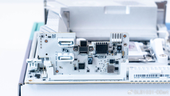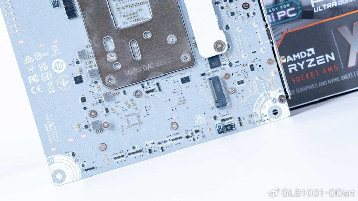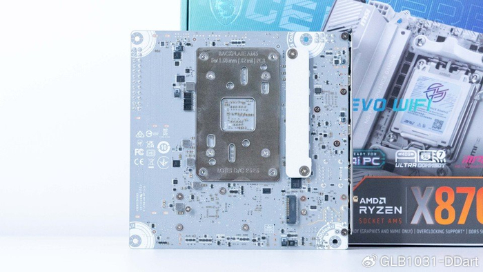 拆下正面堆叠设计的M.2 SSD插板后可以看到下方的X870主板芯片。
