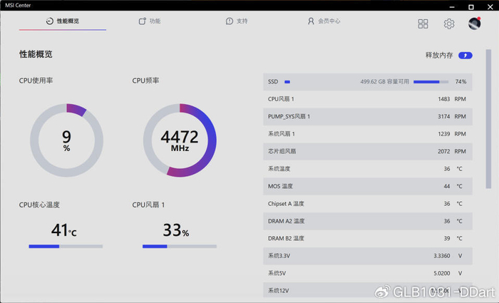 风扇支持智能启停技术,MOS温度低于65℃时风扇处于停转状态,支持在BIOS中自定义风扇的PWM曲线。