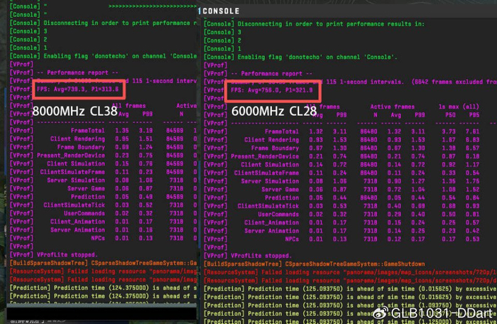 实测同平台下测试对比8000MHz CL38对比6000MHz CL28频率在「CS 2」游戏测试中1080P 分辨率低画质下游戏帧数,可以看到即便内存频率已经达到了8000MHz,实际游戏「帧数收益」还是6000MHz 频率下表现得更好。