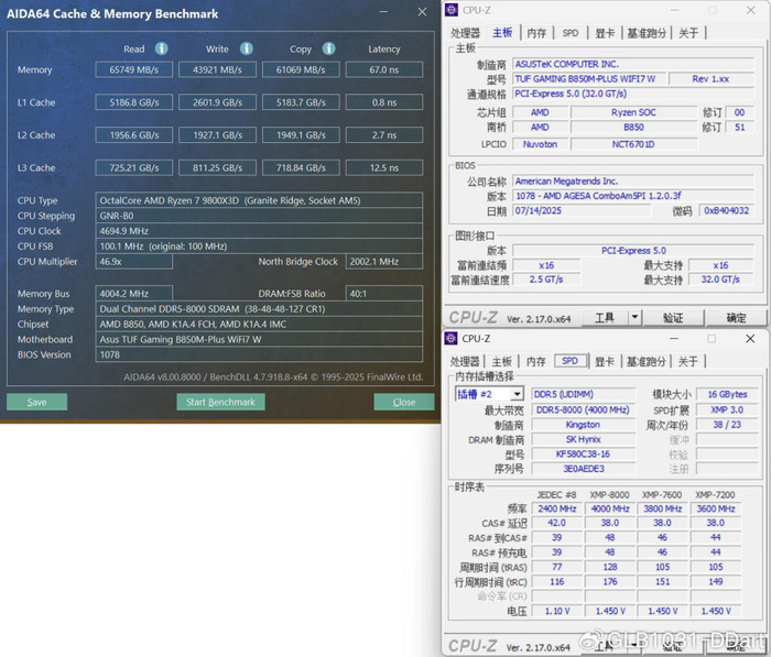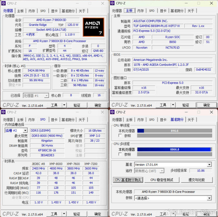 0X3D参数与华硕TUF GAMING B850M-PLUS WIFI7 W重炮手主板以及内存参数,CPU-Z Benchmark 测试成绩如图,测试时已开启PBO 2。