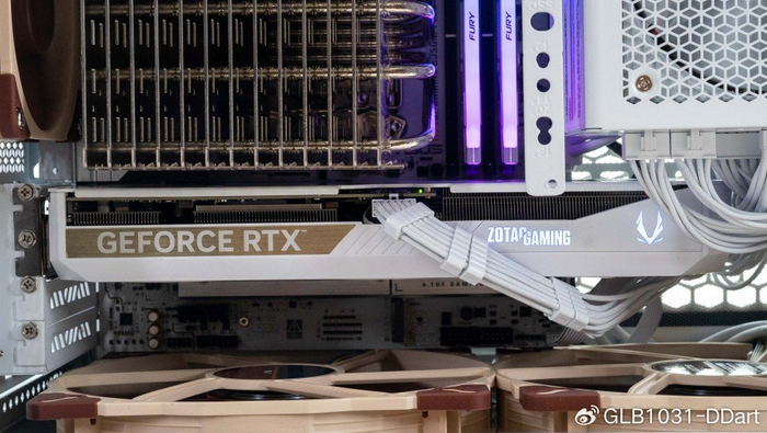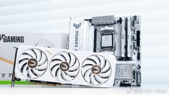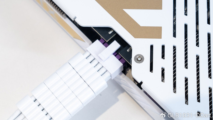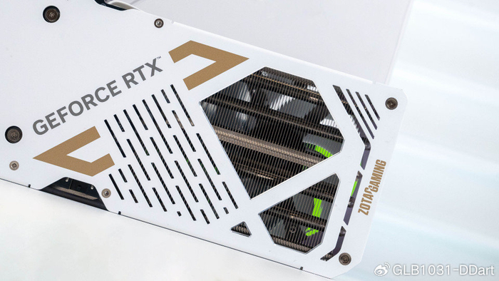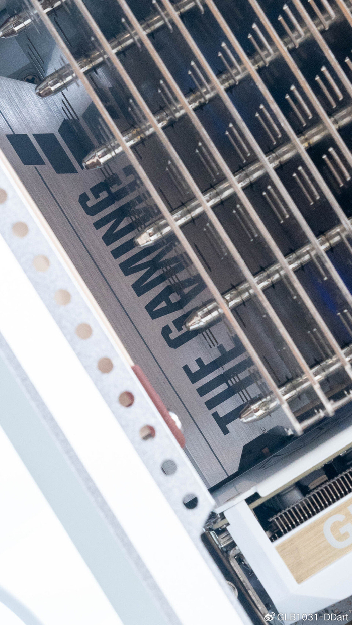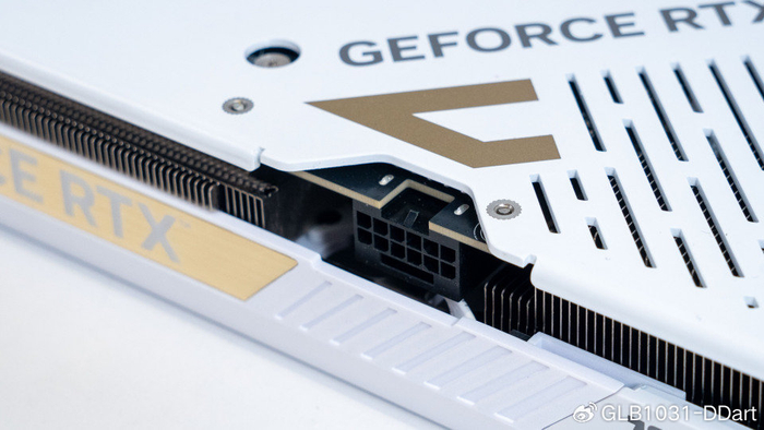 金属背板自然也是标配,白色的金属背板点缀金色装饰效果。显卡的尾端同样做了栅格化的镂空处理,进一步优化气流风道。