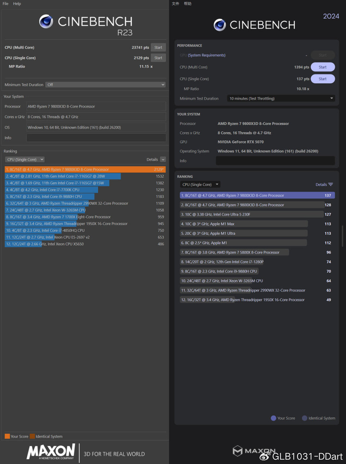 「CINEBENCH R23」:单核 2129 pts,多核 23741 pts