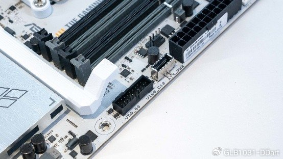 在内存一侧则是直接提供了三个4 Pin风扇插针以及三组5V RGB插针,Debug 指示灯也设计在这个位置。