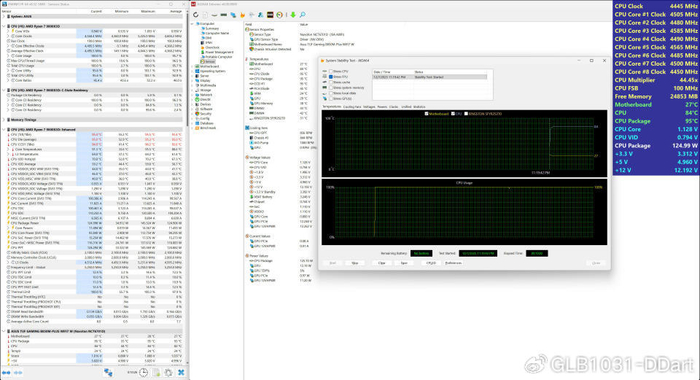 这么多风扇,先看看压力测试部分吧。在AIDA 64 FPU单烤情况下9800X3D处理器最高温度95.5 ℃,最高频率4.5GHz,TDP 126W。