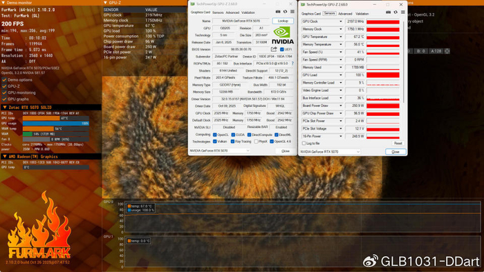 在机箱前20cm+后12cm风扇散热情况下,索泰 RTX 5070 SOLID CORE OC WHITE显卡的Geeks3D FurMark 显卡单烤测试,GPU频率2197 MHz,显卡TDP 250 W,显卡核心温度 67.2 ℃。
