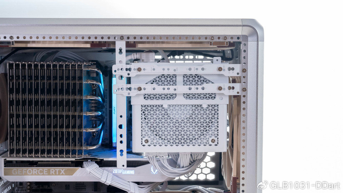 电源改到侧透一侧安装,可以根据电源尺寸调整高度以减少对显卡尺寸的影响。