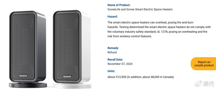 另一类案例,则集中在智能家电领域。2024年,美国CPSC发布召回公告,涉及Govee / GoveeLife品牌的多款智能电暖器。召回原因是产品在无线控制模式下存在过热和起火风险。相关产品在2021年至2024年间,通过Amazon、TikTok Shop及品牌官网销售,总量超过50万台。