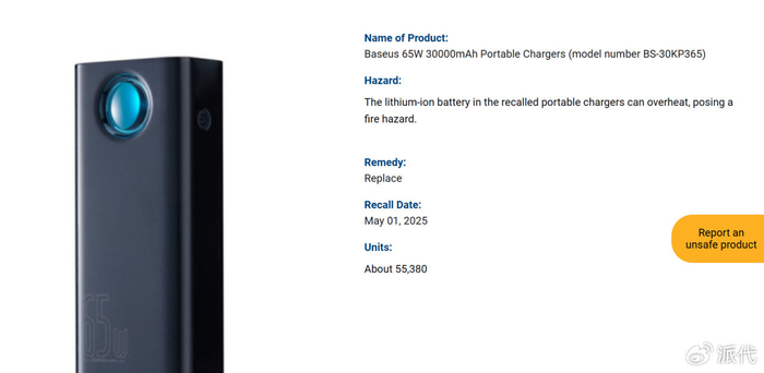 一个典型案例,是来自深圳的消费电子品牌Baseus(倍思)。2025年,倍思在美国市场召回其在2020年至2025年间销售的约55380台便携式充电宝。根据美国消费品安全委员会(CPSC)披露的信息,这些产品存在锂电池过热风险,可能引发火灾。