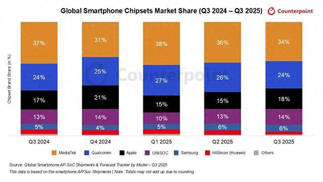 2025年第三季度,全球智能手机芯片市场的王座再次迎来新主人——联发科以34%的份额登顶,这不是一次偶然的市场波动,而是一场持续五年的“全价位段穿透”战略的结果。当行业还在讨论“高端芯片该如何破圈”时,联发科已经用实际成绩给出答案:从旗舰市场的技术突围,到中高端市场的规模深耕,再到AI时代的提前布局,它正在用“全链路竞争力”构建难以复制的壁垒。