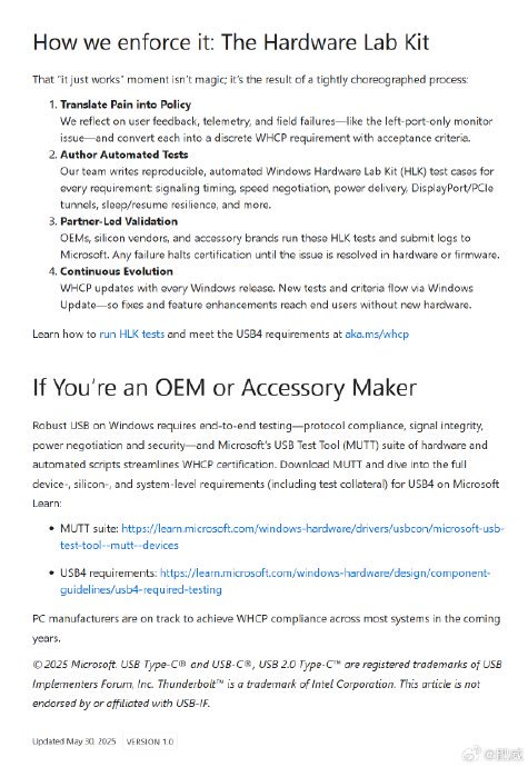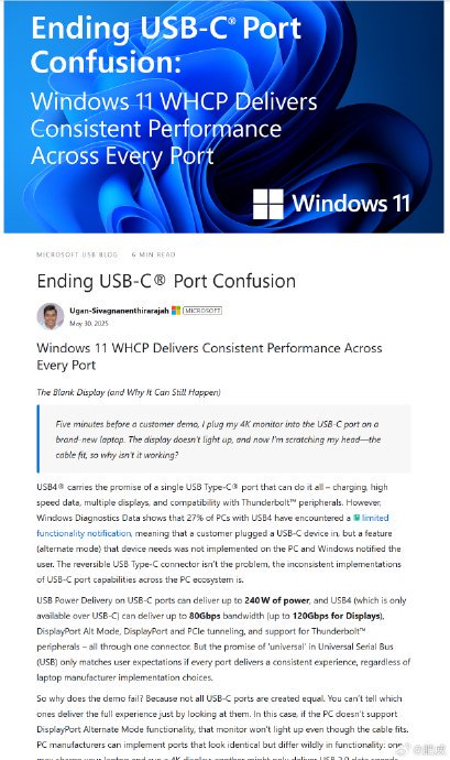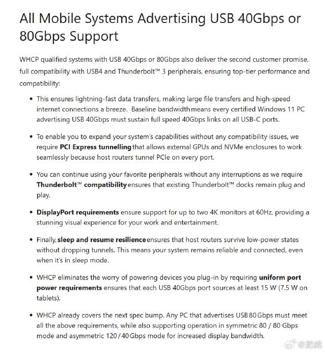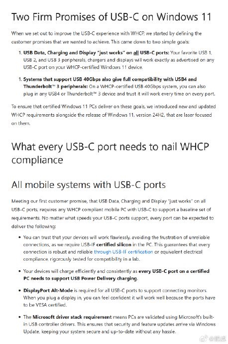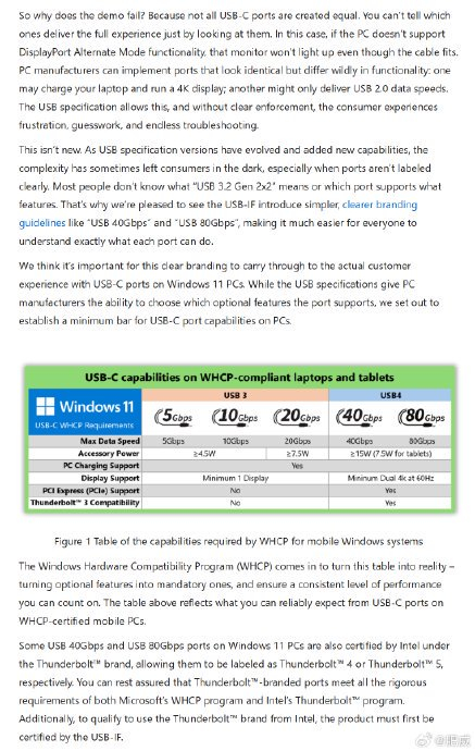 笑死,微软竟然想着去规范USB-C的功能标准,还吐槽之前的定义太复杂(文中特别提到“USB 3.2 Gen 2x2”[笑cry])。说是符合微软WHCP(Windows Hardware Compatibility Program)标准的笔记本和平板都需要兼容USB3/USB4,还要兼容 80Gbps?那AMD平台咋解决?市面上有解决方案了么[吃瓜]文章最后说未来几年,PC制造商有望在大多数系统中实现WHCP合规性。