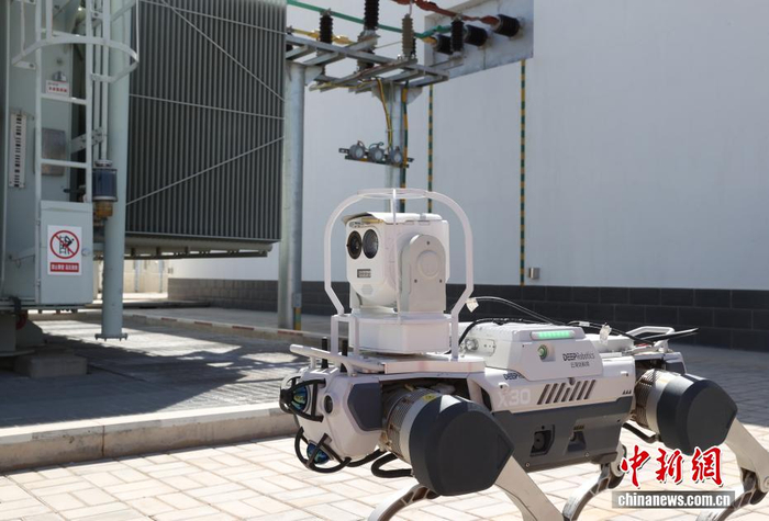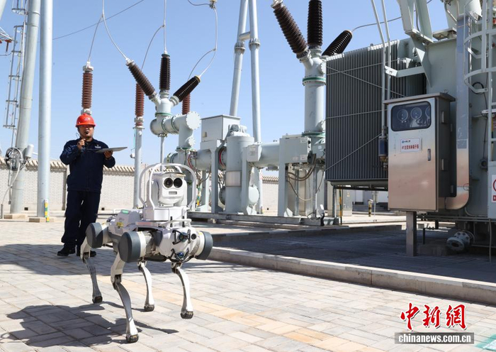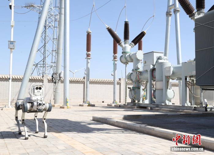 1月3日,记者探访位于宁夏吴忠市利通区的中国首个智能化无人风电场——三峡能源宁夏同利第三风电场。现场,一座总装机容量70兆瓦的风电场正在安静而高效地运转。这里没有运维人员频繁穿梭的身影,也没有控制室彻夜的忙碌,取而代之的是无人机、四足机器人、轨道巡检机器人等300多名智能“员工”在各司其职。图为四足机器人在电厂巡检。中新社记者 于晶 摄