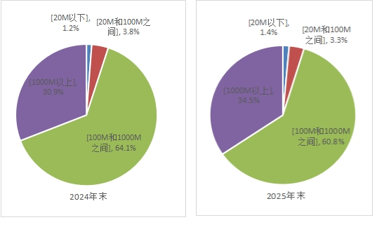 截至2025年底,中国电信、中国移动和中国联通三家基础电信企业的固定互联网宽带接入用户总数达6.91亿户,全年净增2099万户。其中,100Mbps及以上接入速率的用户为6.59亿户,全年净增2299万户,占总用户数的95.3%,占比较上年末提高0.4个百分点;1000Mbps及以上接入速率的用户为2.38亿户,全年净增3157万户,占总用户数的34.5%,占比较上年末提高3.6个百分点。截至2025年底,光纤到房间(FTTR)用户达5939万户。