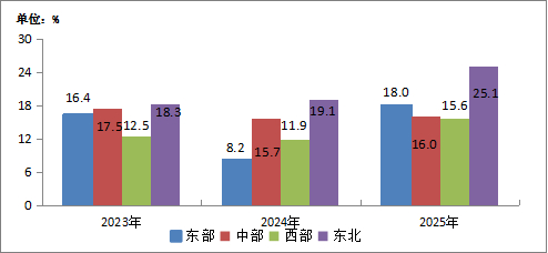 2023—2025年东、中、西、东北地区移动互联网接入流量增速情况