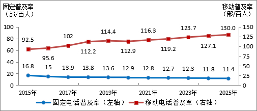 截至2025年底,全国电话用户总数达到19.87亿户,全年净增3091万户。其中,移动电话用户总数18.27亿户,全年净增3725万户,普及率为130部/百人,比上年末提高2.9部/百人。其中,5G移动电话用户达到12.04亿户,占移动电话用户的65.9%,比上年末提高9.2个百分点。固定电话用户总数1.6亿户,全年净减633.7万户,普及率为11.4部/百人,比上年末下降0.4部/百人。