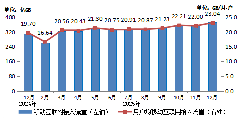 2025年,移动互联网接入流量达3958亿GB,比上年增长17.3%。截至2025年底,移动互联网用户达16.1亿户,全年净增3965万户。全年移动互联网月户均流量(DOU)达20.74GB/户·月,比上年增长14.1%;12月当月DOU达23.04GB/户,较上年底提高3.34GB/户。