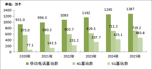 截至2025年底,全国移动电话基站总数达1287万个,比上年末净增22.7万个。其中,4G基站为719.2万个,比上年末净增8万个。5G基站为483.8万个,比上年末净增58.8万个,5G基站占移动电话基站总数达37.6%,占比较上年末提升4个百分点。其中,具备5G RedCap接入能力的基站数达206.4万个,占5G基站的42.7%。