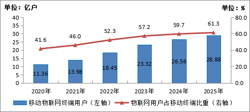 截至2025年底,中国电信、中国移动和中国联通三家基础电信企业发展移动物联网终端用户28.88亿户,全年净增2.32亿户,超过移动电话用户数10.61亿户,占移动网终端连接数的比重达61.3%。