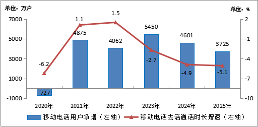 2025年,全国移动短信业务量23020亿条,比上年增长14.2%,移动短信业务收入比上年下降2.4%。全国移动电话去话通话时长2.02万亿分钟,比上年下降5.1%。