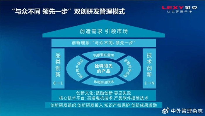 倪祖根将其提炼为:全新品类创新(0→1)和技术创新(1→N),即追求与众不同的产品概念和性能指标上的遥遥领先。这是莱克电气在模式管理上的又一创新——“与众不同,领先一步”的双创研发管理模式。这也是莱克电气在行业诸多龙头既有强势地位中能够后来者居上站稳脚跟的一大法宝。