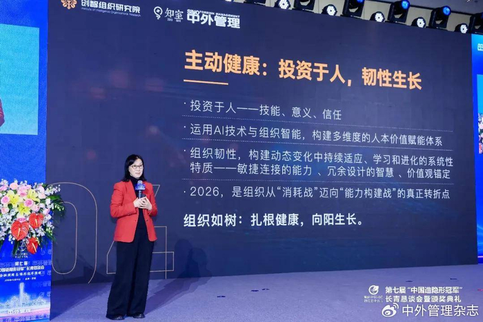 “中国造隐形冠军”评委、上海创智组织管理数字技术研究院院长陈春花在大会压轴演讲中,以“2026年经营关键词:中国隐形冠军企业持续增长之选”为题,系统分析了2026年的经营气候,并围绕“价值跃迁、AI+/+AI、共益共生、主动健康”等关键战略维度给出了她的答案。她特别强调,“我们依然相信,商业的底色始终是人与人的联结。”企业必须牢牢守住“为客户创造价值”这一经营本质。2026年,不应是一个令人担忧的明天,而是一个可以用善意、智慧与双手主动塑造的未来。