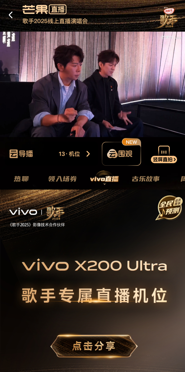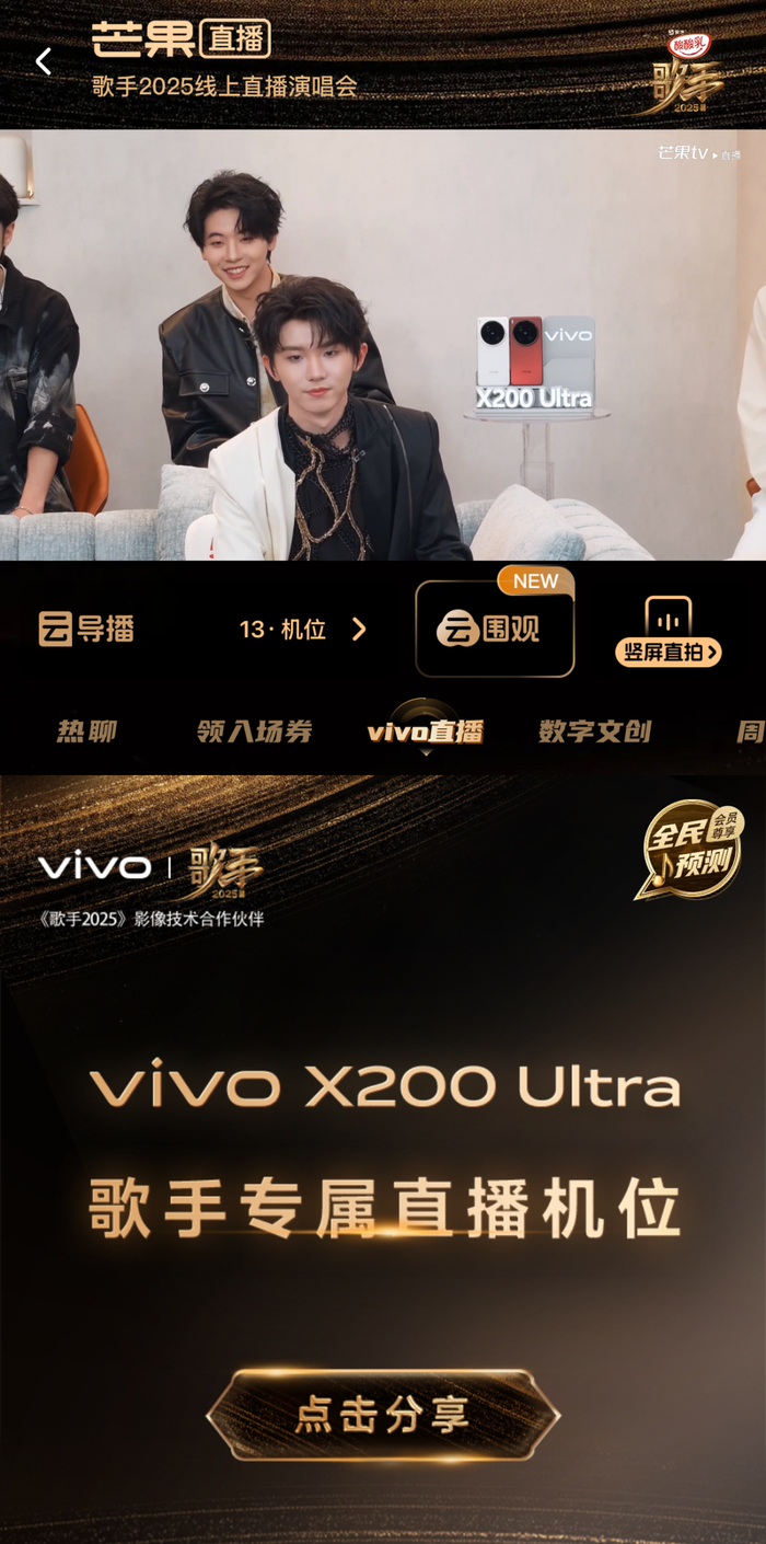 继2025春晚手机直播的突破性尝试后,此次vivo X200 Ultra不再只是借势IP进行常规赞助,而是以 “影像技术合作伙伴” 身份深度介入《歌手2025》的内容生产链条,系统性渗透专业创作领域。通过在节目现场部署山顶专区、定制专属直播机位、输出长焦直拍素材,并打造“V单时刻” 歌手小剧场,不仅完美呈现了舞台表演的高光瞬间与歌手台前幕后的真实状态,更见证了vivo从 “消费级设备” 到 “专业创作工具” 的身份跨越。