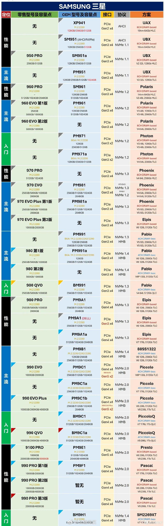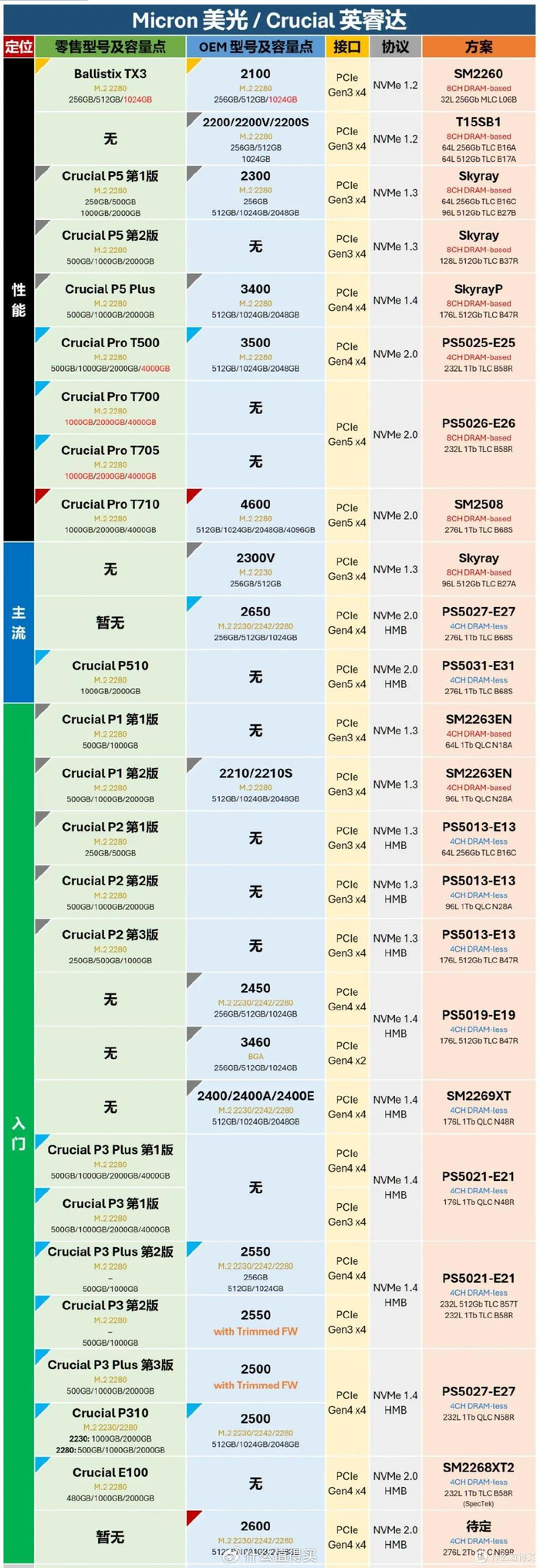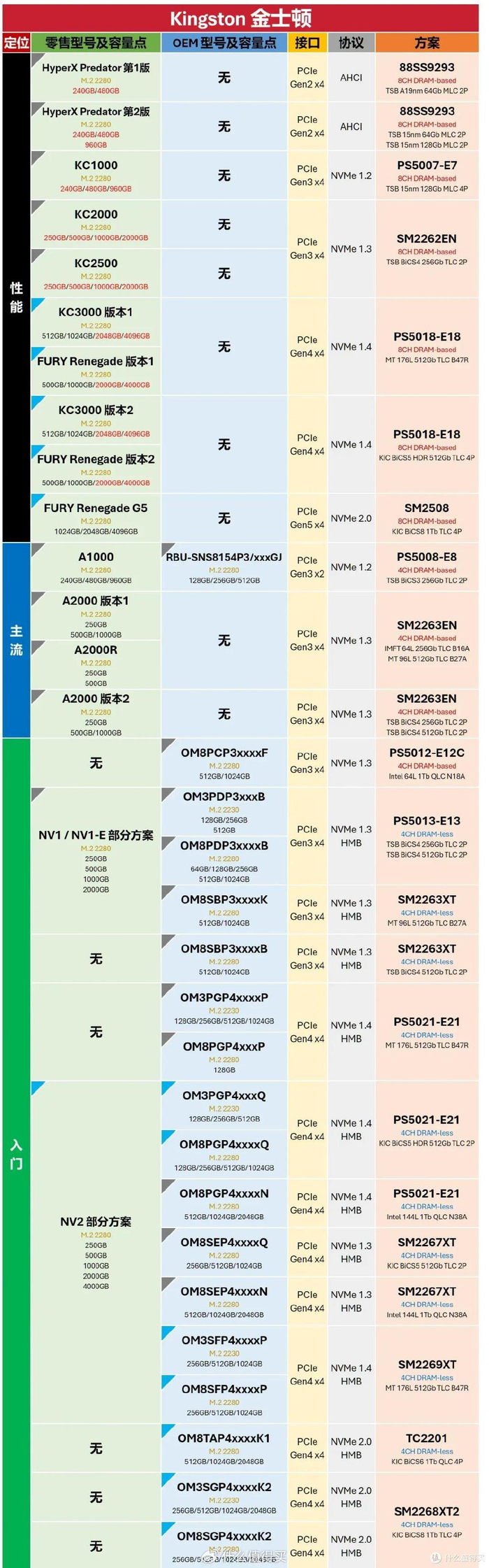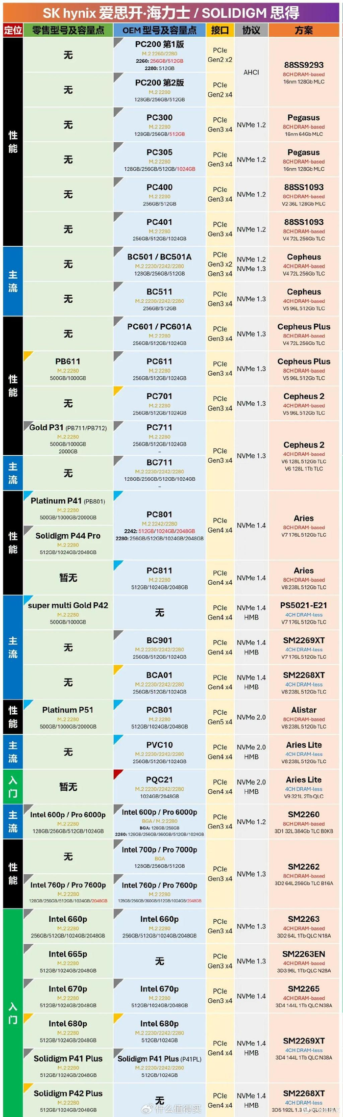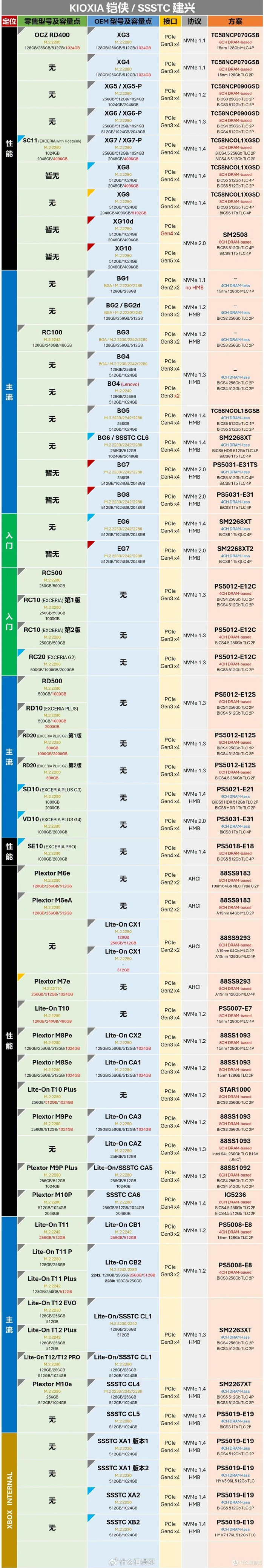 看过我之前几次转载的朋友们想必都知道,这张表格信息量极大,几乎将几家主流存储大厂的M.2 SSD的型号全部收录了,在其中不仅能查询到零售与OEM版型号之间的对应关系,而且还能查找各型号的主控、NAND等硬件方案信息,可谓是SSD爱好者必备的工具之一。