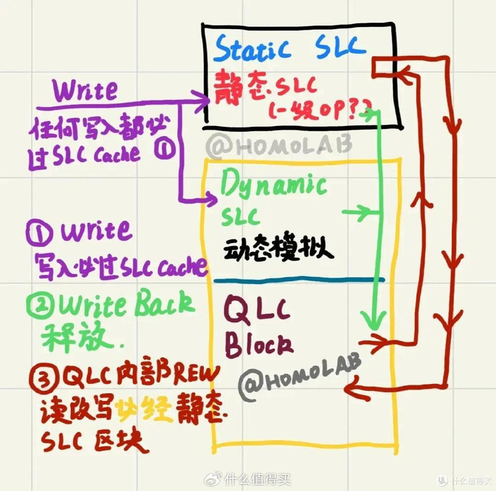 根据HOMOLAB的分析,nCache 4.0方案的策略是,SSD在持续进行数据写入时,即便SLC Cache耗尽,也必须先向SLC Cache写入,随后数据才能被释放并写入TLC区块。
