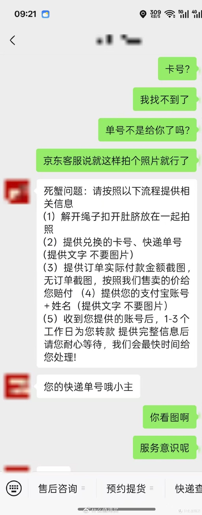 他们家售后和兑换都不走京东的系统,走的是自己家的系统,感觉有点打擦边球,因为我知道今年的蟹卡似乎都要求在京东的平台兑换和售后,阳澄状元这种跳转自己第三方平台的,可能是违规的,售后体验也不如官方好用,需要你提供各种信息,甚至你发截图的单号他还要你手打给他,有点没有服务意识,不太快乐。