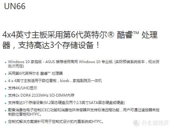 这台华硕UN66准系统其实就是华硕主板的型号UN66来命名的,上官网可以看到这款主板的介绍,官方介绍这款4 x 4英寸主板适用于数位看板,kiosk,家庭剧院及一体机,可以根据要求进行定制。