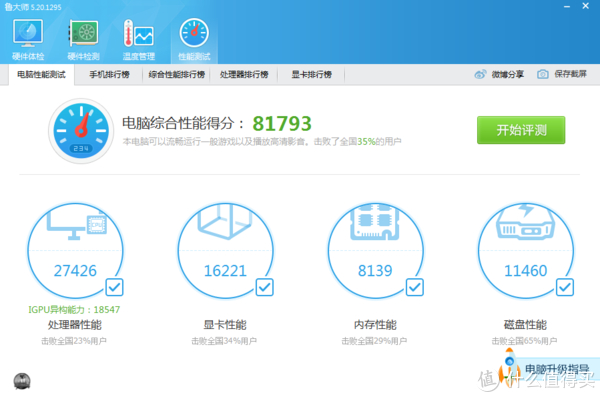 看下跑分成绩,居然有8万多分,处理器4代i5-4200性能与i3-6100U差不多,让人惊讶;显卡性能项Nvidia GT740M则几乎是英特尔 HD520的一倍;内存性能项DDR4比DDR3高?真是不能理解;磁盘性能项固态比机械高了一倍