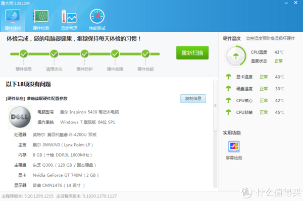 再看下灵越14-5439在鲁大师中的表现,采用四代酷睿i5-4200U,是双核心的。原先是4G内存我换成了8G,硬盘是东芝的Q300固态,显卡是Nvidia GT740M
