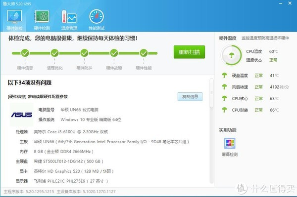 安装驱动后用娱乐大师看下配置,识别为华硕UN66台式电脑,芯片组是9D48笔记本芯片组,查询了下可能是100 Series 芯片组。四代酷睿i5-4200U,是双核心的,8G金士顿DDR4内存,硬盘是希捷的500G机械硬盘