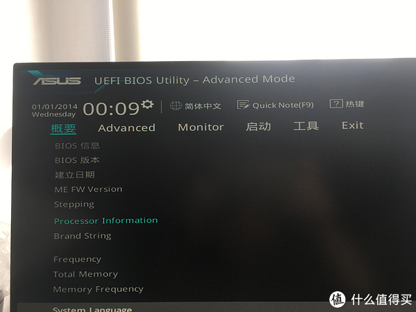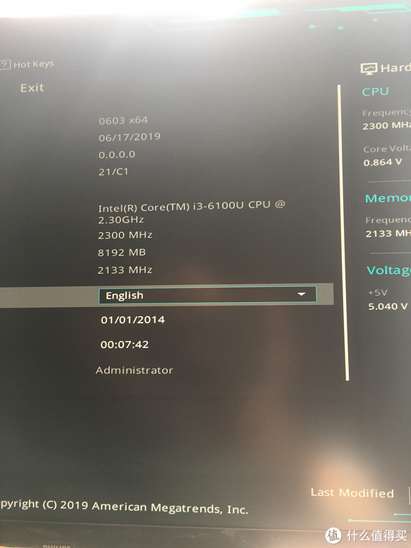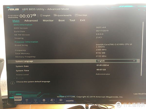 可以看到显示主板的BIOS是2019年的,应该是最新的,CPU是i3-6100U,主频是2.3GHz,内存是8192MB,频率是2133MHz。系统语言是英语,系统时间是2014年1月1日。看来是有段时间了