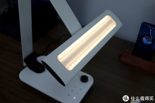此外,偏光光学配件和侧发光技术的应用,使得台灯中心区域到边缘的光线强度一致,保证光线铺向桌面时,可以保持均匀明亮,减缓用眼疲劳,平时可以根据自己的需求选择冷暖光线和不同的亮度,也可以直接“一键智能调光”。我还发现,长按色温可以一键调整到色温中间值(4500~5000K),长按亮度可以一键调整到固定亮度(1000流明),同样,如果你之前自定义了“移光”,也可以通过长按恢复到默认的居中状态。
