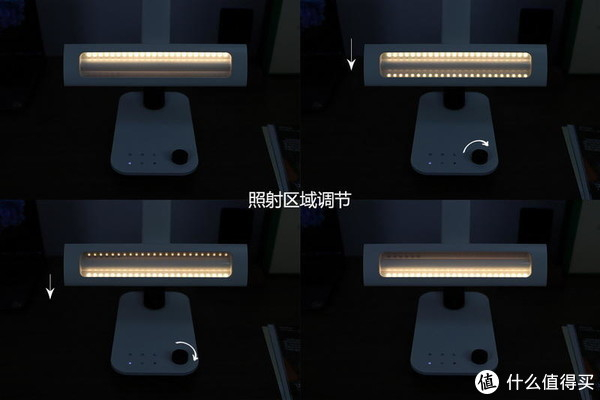 下图是在触控板上点按“照射区域”调节键后,通过旋转旋钮得到的“移光”效果,双排灯珠的明暗会有“移动”的渐变,表现在桌面照明则是光照区域的前后移动,再配合灯头的角度调节,桌面结合立柱的180°俯仰调节,一张140cm x 70cm的学习桌,照明需求轻松解决。
