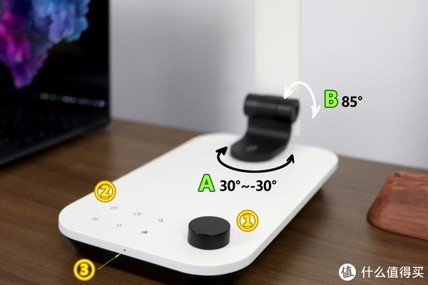 灯座顶部就是按键面板区,包括一个可点按、旋转的多功能按钮①,6枚触控键的控制面板②,灯座前侧还有个电源指示灯③,下图可以看到底座有个俯仰85°调节的关节B,和可以左右扭转30°调节的关节A,这样平时几乎不用挪动灯座,灯光照明就可以兼顾左右两个方向。