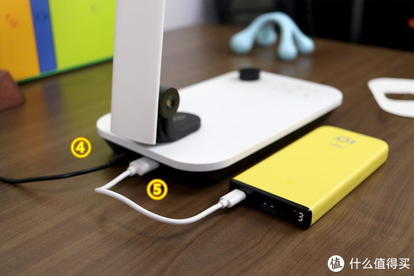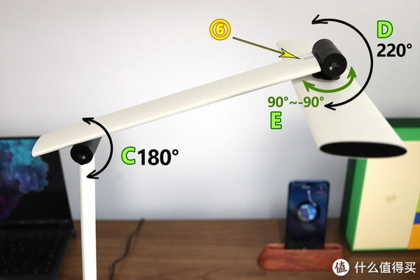 灯体上部也有3个多角度调节的关节,下图我给标出来了,其中灯头可以“上下翻”,也可以左右旋转变为竖直方向,注意下图⑥号位置有个亮度感应器,有了它就可以通过触控键一键感应调光,通过环境光线设置为最佳的护眼照明状态。