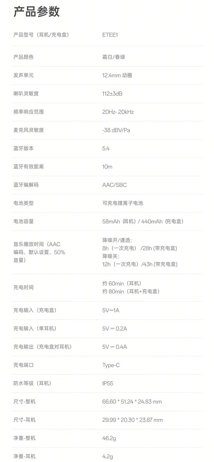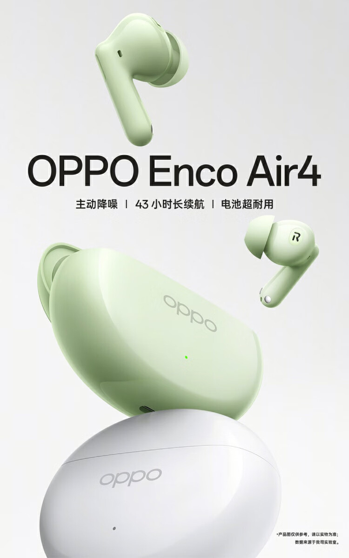 OPPO Enco Air4 支持 ANC 主动降噪(参数未提供具体降噪数值)与通透模式;采用 12.4mm 动圈单元;支持空间音效;有霜白与春绿两种颜色可选,单耳重 4.2g。