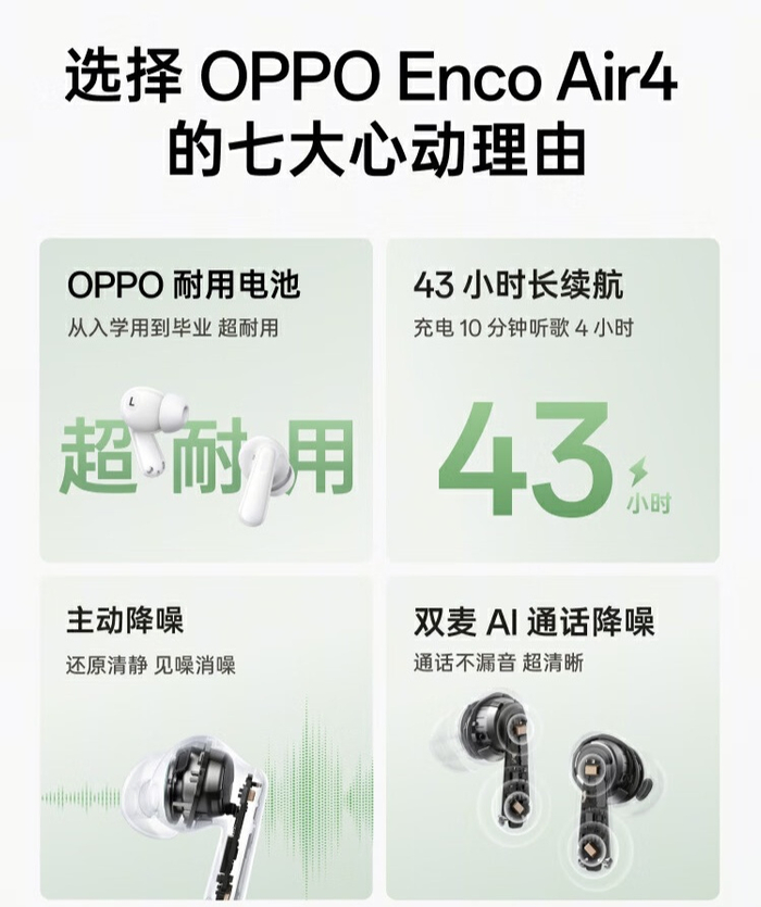 OPPO Enco Air4 搭载 OPPO“千次循环耐用”电池,号称“从入学用到毕业”;充电盒 + 耳机关闭降噪情况下续航达 43 小时;充电 10 分钟可听歌 4 小时;支持 IP55 防尘防水;蓝牙 5.4 协议。