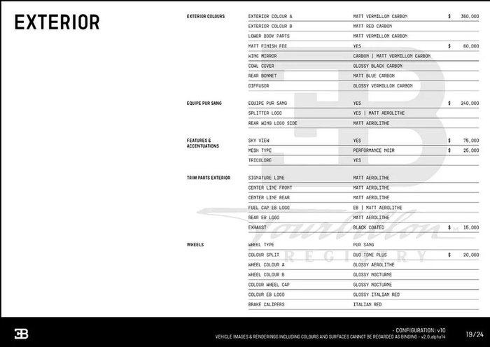 根据曝光的清单,在外观方面仅哑光朱红碳纤维车漆一项,就需要 36 万美元,近乎一辆豪华轿车价格。此外再叠加 Equipe Pur Sang 套件,用户需要额外花费 60 万美元。